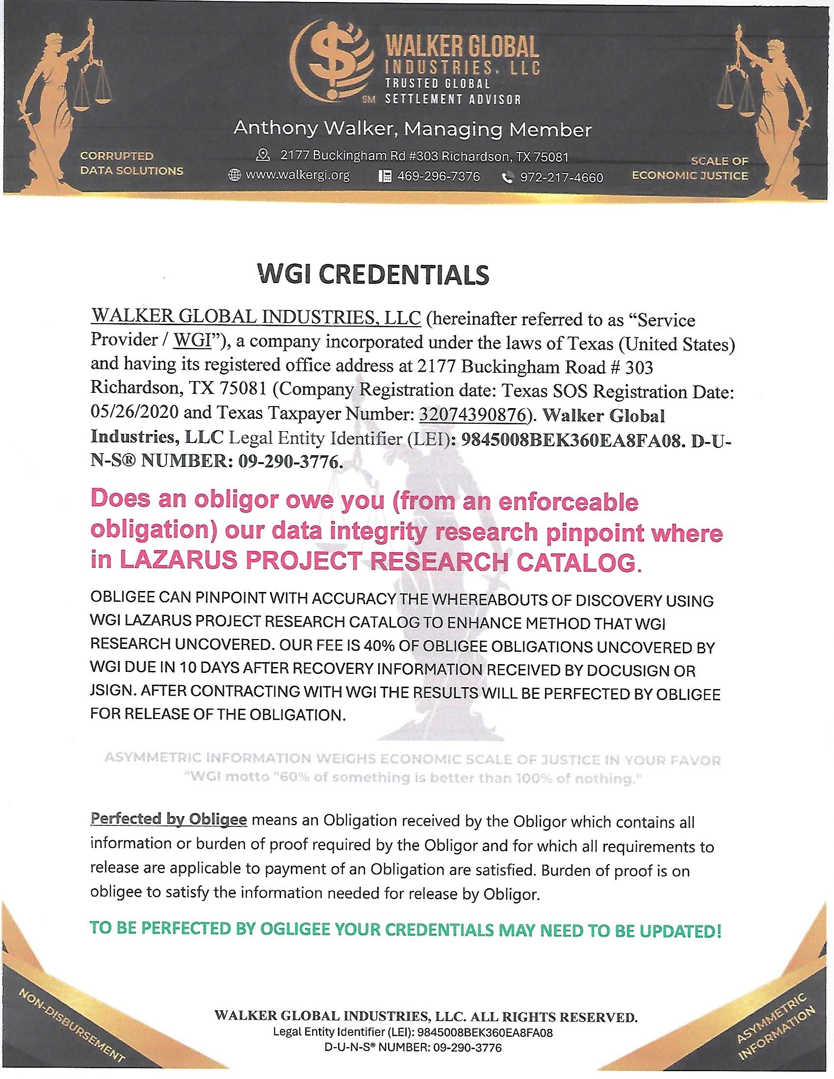 For purposes of any Agreement with WGI, the "Business Transaction" shall be defined as assisting Client with Asymmetric Information regarding transactions where one party is well informed compared to client. In finding and recovering entitlement items due WGI clients will pay a minimum ten percent but not more than 40% maximum fee consulting service fee for any proposed Business Transaction. You’re receiving this because of a security interest WGI has found in your interest.