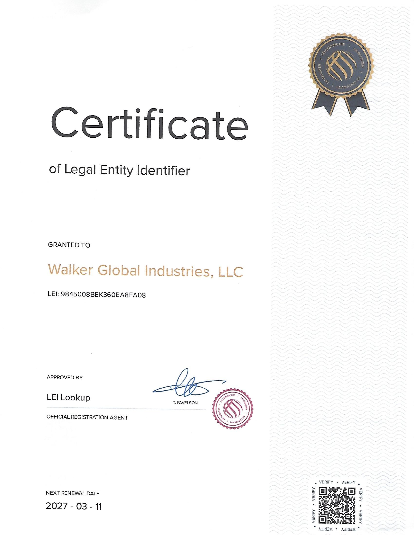 WALKER GLOBAL INDUSTRIES, LLC (hereinafter referred to as “Service Provider / WGI”), a company incorporated under the laws of Texas (United States) and having its registered office address at 2177 Buckingham Road # 303 Richardson, TX 75081 (Company Registration date: Texas SOS Registration Date: 05/26/2020 and Texas Taxpayer Number: 32074390876)